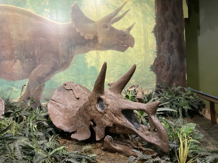 The Makoshika display had interesting bits about the big frill on the Triceratops. It had a lot of blood vessels, which possibly fed a network of feathers or a colorful keratin sheath. Elsewhere I’ve seen that the horns of an adult Triceratops are actually hollow and wouldn’t be much use for self defense. Perhaps it was just a showy display to attract the lady Triceratops?