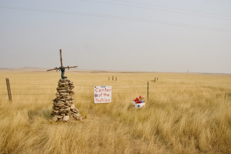 The geographic center is actually out in a field, behind a gate and fence and not far from a tattered American flag.