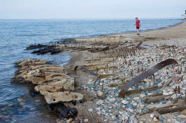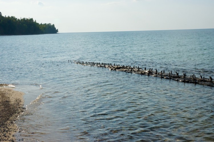 There are the remains of several shipwrecks visible in the shallow water along the shore, testament to the dangers of shipping and travel on Lake Superior.